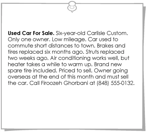 No. 148 According to the advertisement, why is Ms. Ghorbani selling her car?